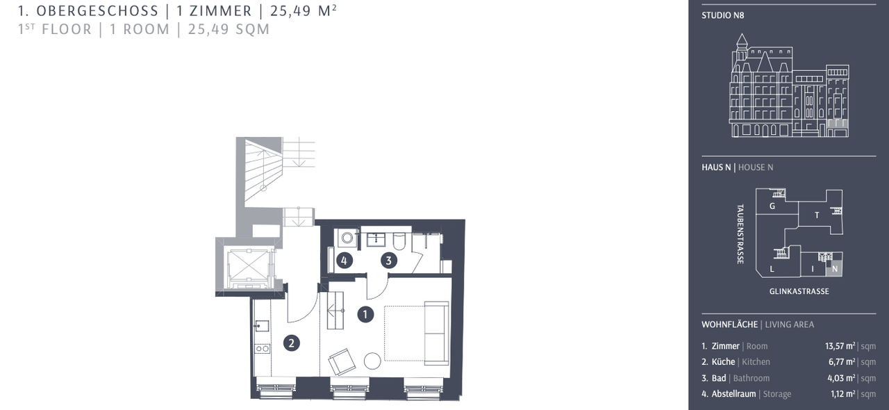 | Unit N08 | Floor Location 1st floor | Room 1 | Living space ca. 25.5 m² | Price 375,000 € | Status Available |
