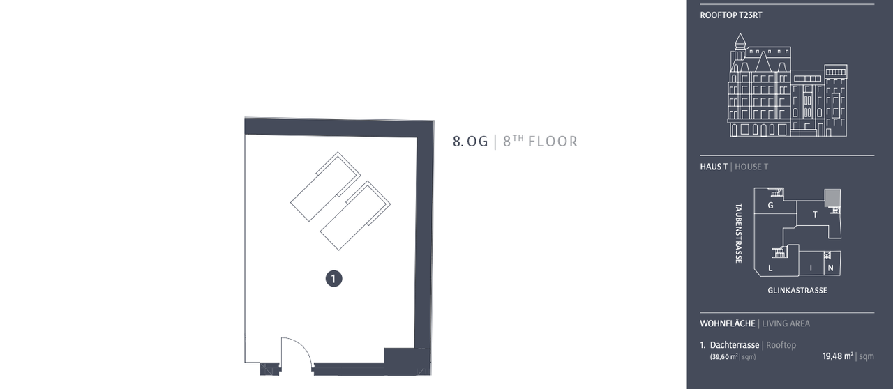 | Unit T23 | Floor Location 7th +8th floor | Room 2 | Living space ca. 124.8 m² | Price 2,100,000 € | Status Available |