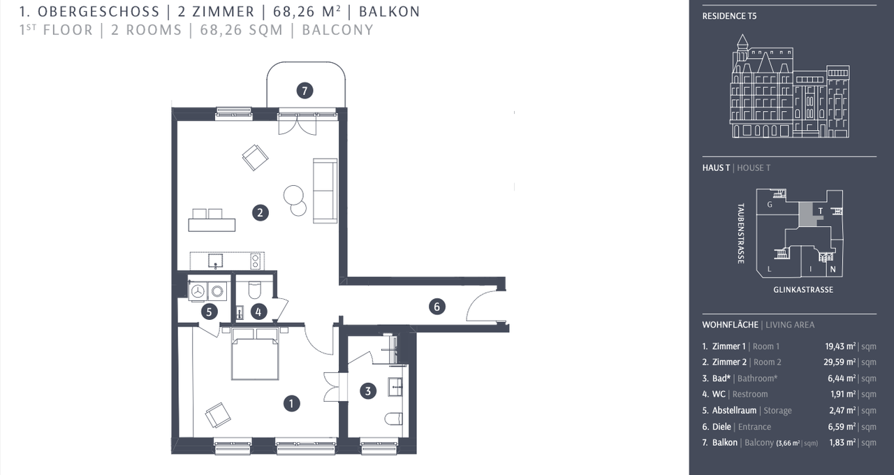 | Unit T05 | Floor Location 1st floor | Room 2 | Living space ca. 68.3 m² | Price 990,000 € | Status Available |
