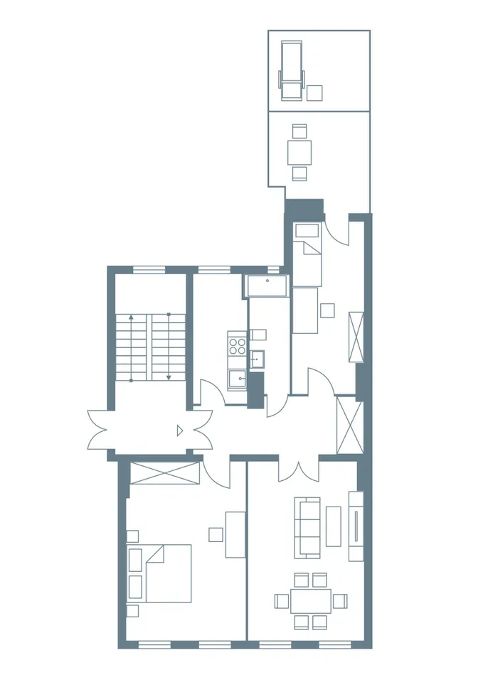 Schon beim Betreten des Hauses wird man von einem Treppenhaus empfangen, das den historischen Charakter des Altbaugebäudes unterstreicht. Die extravagante Fassade verleiht dem Gebäude eine einzigartige Erscheinung, die Blicke auf sich zieht und einen bleibenden Eindruck hinterlässt.