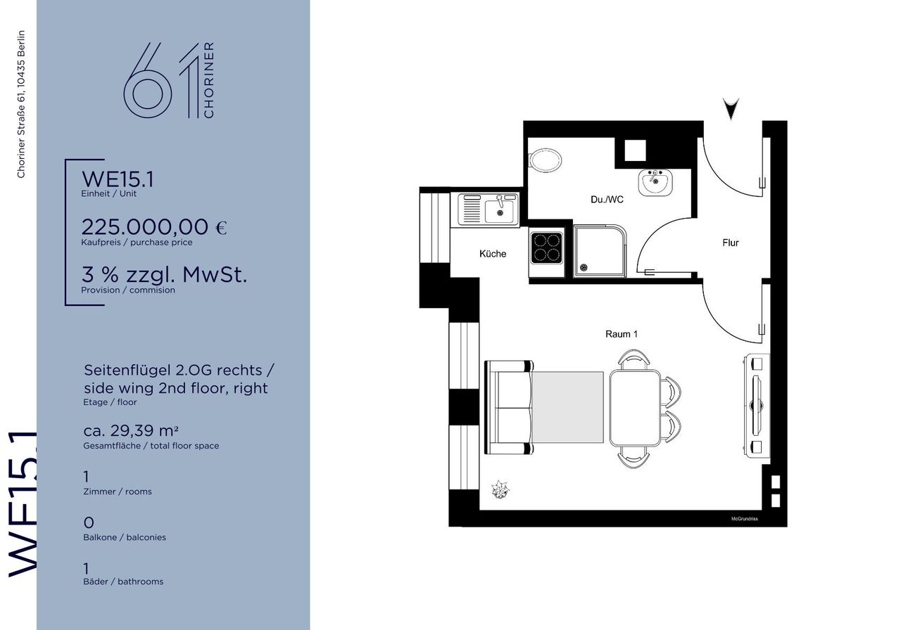 | Einheit WE15.1 | Etagenlage SFL 2.OG rechts | Zimmer 1 | Wohnfläche ca. 29,4 m² | Preis 225.000 € | Status Verfügbar |